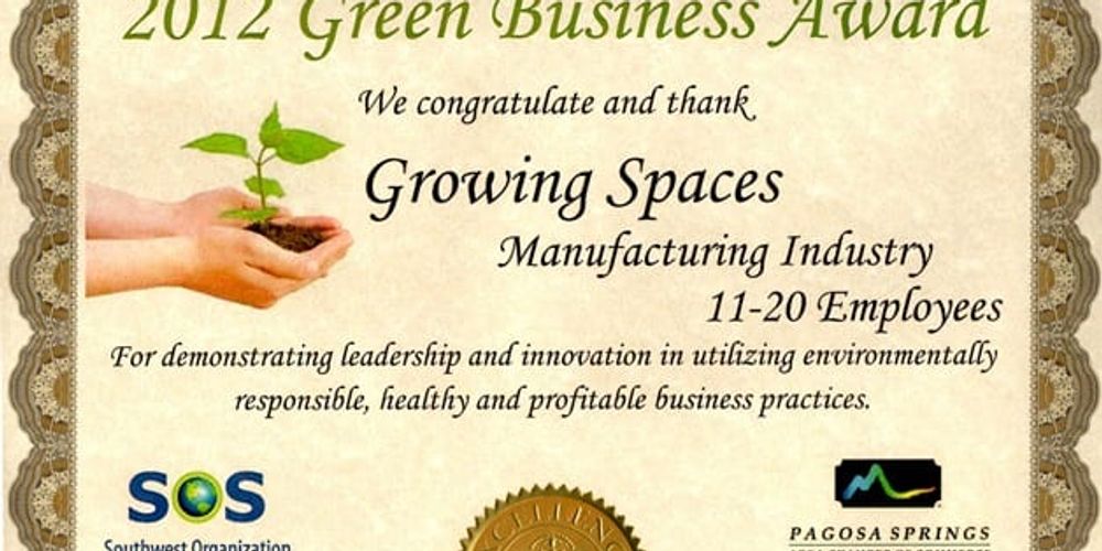 On January 19th, 2013, Growing Spaces was privileged to be awarded the “Green Business of the Year” by the Pagosa Springs Area Chamber of Commerce and the Southwest Organization for Sustainability. We stood among many other businesses in our small community who demonstrate the need to do things differently. This honor came out of our goal last year to expand our focus on education to describe the LIFESTYLE THAT INCLUDES a Growing Dome. Udgar and I have lived that lifestyle now since the late seventies.