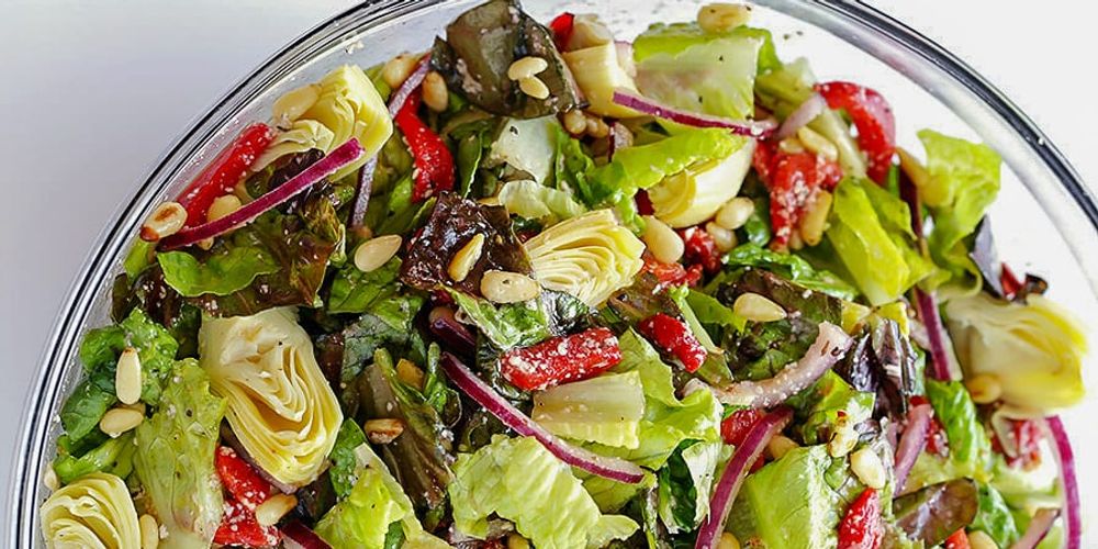 1 head red-leaf lettuce, chopped into bite-sized pieces 1 head romaine lettuce, chopped into bite-sized pieces 1/2 small red onion, peeled and thinly sliced 14 oz. artichoke hearts, roughly chopped 12 oz. roasted red peppers, diced 1/2 cup toasted pine nuts 1 batch zesty red wine vinaigrette (see below) *optional: extra freshly-grated parmesan cheese (helps the dressing stick)