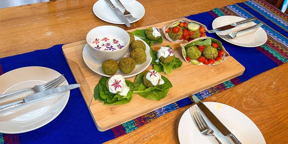 Our Growing Domes are still full of cold hardy crops like lettuce and herbs. Our cute baby Meyer lemon tree has fruit ripe for the picking. And since temperatures are warming up, our borage is in full bloom! We wanted to make the most out of these fresh and vibrant flavors, so we are coming to you this month with a vegetarian Mediterranean treat, borage tzatziki and gluten-free falafel! This is also a great dish to add to your meal rotation during Lent.