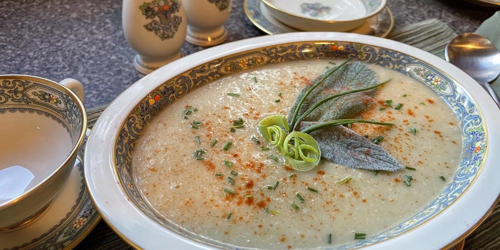 Remove from heat to cool down slightly, and blend with a food processor or immersion blender until smooth. It may take a couple of batches to blend. Serve in a soup bowl with sage, chives, or a leek garnish and a small dash of smoked paprika.