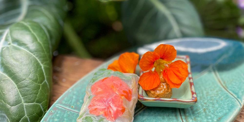 This bright, satisfying, yet light lunch keeps you going through your afternoon, or you can use it as an appetizer to a favorite Thai dinner entree or even pho. Nasturtium spring rolls with Thai peanut sauce are perfect for any warm-weather meal. Easy to make, the nasturtium packs an unexpected punch in a spring roll. They are so pretty you may not want to eat them, but they are equally delicious!