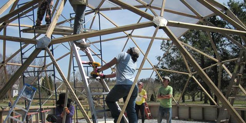 As the 33′ Growing Dome at the Shumei Natural Agriculture Garden at the Rodale Institute continues to take shape we see how many wonderful volunteers are pitching in to make this project happen. Richard Miller, Growing Spaces installation supervisor, has been kind enough to send us updates as they go.