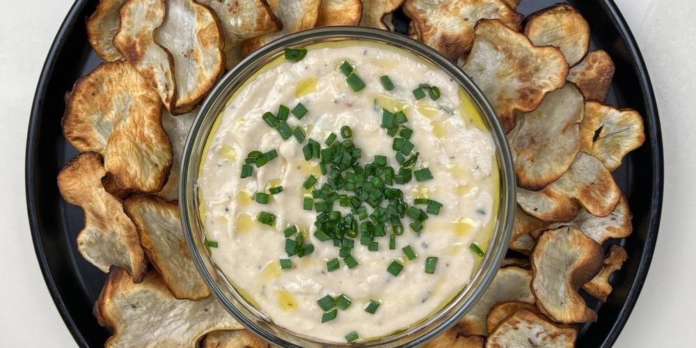 Want to serve a fun unique spin on a party classic this holiday season? This rosemary and roasted garlic with sunchoke chips is sure to WOW your friends and family.