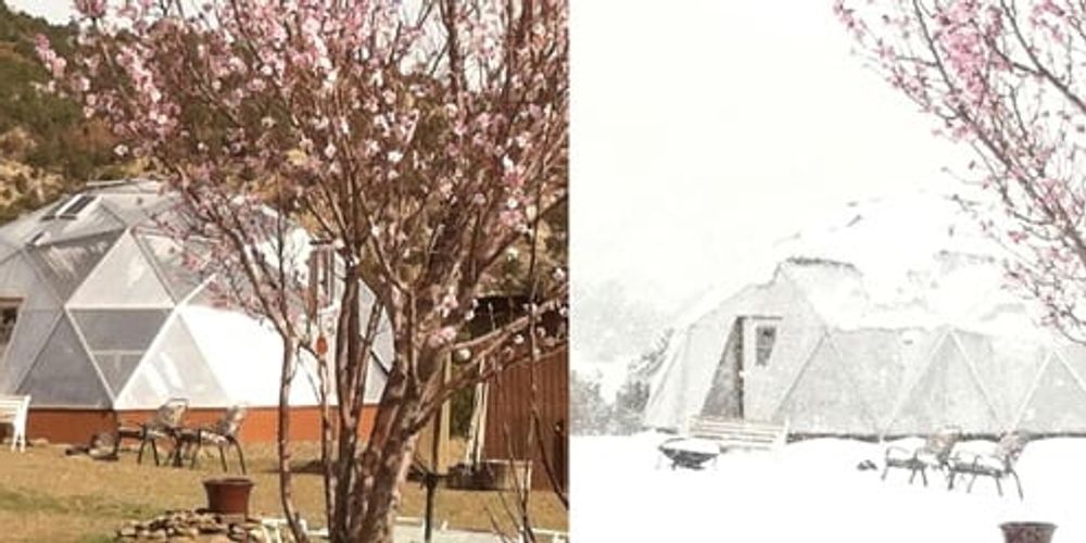 Congratulations to Cate Graber on winning the Dome of the Month contest for May 2013. This fun pair of photos of her 26′ Growing Dome greenhouse in Trinidad, Colorado shows how quickly the weather can change in the Rocky Mountains. Her peach tree had just decided to start blooming above 6,400 feet. Then Mother Nature had a different plan. Sunny and dry one day and blizzard and cold the next…literally. All her plants tucked safely inside the greenhouse kept growing blissfully along.